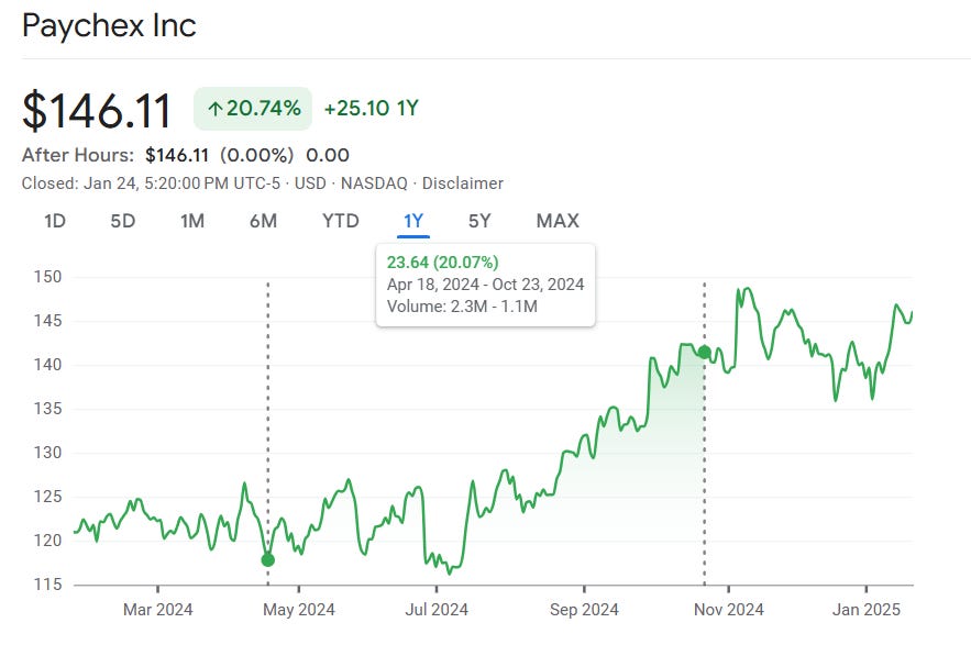 Another instance involved Paychex, which I purchased and subsequently sold after a 20% gain, scared that it had become overpriced and a correction was imminent.